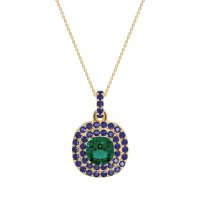 This Lab Emerald and Blue Sapphire Necklace is casted in 14k Yellow Gold. This Women’s Halo necklace features exceptionally fine gemstones, on par with those found in the world's most exclusive boutiques and among the top 10% available globally. Double Halo Pendant Showcasing A Cushion-cut Center Stone Framed By A Double Halo Of Shimmering Accents. This necklace comes with a complimentary 18-inch chain. Enjoy the confidence of our 30-day, stress-free return policy—with return shipping fully covered. Each piece is also accompanied by a Lifetime Warranty, ensuring lasting beauty and peace of mind.