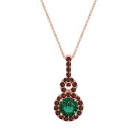 This Lab Emerald and Ruby Necklace is casted in 18K Rose Gold. This Women’s Halo necklace features exceptionally fine gemstones, on par with those found in the world's most exclusive boutiques and among the top 10% available globally. This Double Halo Pendant Features A Round Stone Surrounded By A Large Halo Of Gems, Set Below Another Smaller Halo Of Gems, All Held By A Gem Studded Bail. This necklace comes with a complimentary 18-inch chain. Enjoy the confidence of our 30-day, stress-free return policy—with return shipping fully covered. Each piece is also accompanied by a Lifetime Warranty, ensuring lasting beauty and peace of mind.