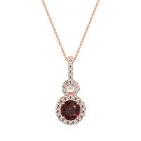 This Lab Ruby and Lab Diamond Necklace is casted in 14K Rose Gold. This Women’s Halo necklace features exceptionally fine gemstones, on par with those found in the world's most exclusive boutiques and among the top 10% available globally. This Double Halo Pendant Features A Round Stone Surrounded By A Large Halo Of Gems, Set Below Another Smaller Halo Of Gems, All Held By A Gem Studded Bail. This necklace comes with a complimentary 18-inch chain. Enjoy the confidence of our 30-day, stress-free return policy—with return shipping fully covered. Each piece is also accompanied by a Lifetime Warranty, ensuring lasting beauty and peace of mind.
