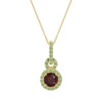 This Lab Ruby and Peridot Necklace is casted in 14k Yellow Gold. This Women’s Halo necklace features exceptionally fine gemstones, on par with those found in the world's most exclusive boutiques and among the top 10% available globally. This Double Halo Pendant Features A Round Stone Surrounded By A Large Halo Of Gems, Set Below Another Smaller Halo Of Gems, All Held By A Gem Studded Bail. This necklace comes with a complimentary 18-inch chain. Enjoy the confidence of our 30-day, stress-free return policy—with return shipping fully covered. Each piece is also accompanied by a Lifetime Warranty, ensuring lasting beauty and peace of mind.