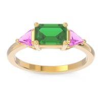 This 18k Yellow Gold Emerald ring features a AAAA Emerald Emerald, along with fine quality Pink Tourmaline. This Ring Features An Emerald Cut Center Stone in The Modern East-West Design Accented with Two Trillion Shaped Gems in A Three Stone Setting. We only use the top 10% of gems available, those found in the finest jewelry shops across the world. This Emerald engagement ring can also be worn as an Emerald and Pink Tourmaline gemstone ring and added to your collection! Enjoy Free Shipping and Returns, Free Resize and a lifetime warranty.