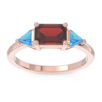 This 14K Rose Gold Garnet ring features a AAAA Emerald Garnet, along with fine quality Swiss Blue Topaz. This Ring Features An Emerald Cut Center Stone in The Modern East-West Design Accented with Two Trillion Shaped Gems in A Three Stone Setting. We only use the top 10% of gems available, those found in the finest jewelry shops across the world. This Garnet engagement ring can also be worn as an Garnet and Swiss Blue Topaz gemstone ring and added to your collection! Enjoy Free Shipping and Returns, Free Resize and a lifetime warranty.
