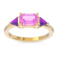 This 18k Yellow Gold Pink Tourmaline ring features a AAAA Emerald Pink Tourmaline, along with fine quality Amethyst. This Ring Features An Emerald Cut Center Stone in The Modern East-West Design Accented with Two Trillion Shaped Gems in A Three Stone Setting. We only use the top 10% of gems available, those found in the finest jewelry shops across the world. This Pink Tourmaline engagement ring can also be worn as an Pink Tourmaline and Amethyst gemstone ring and added to your collection! Enjoy Free Shipping and Returns, Free Resize and a lifetime warranty.