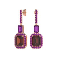 These Garnet earrings and made in 18K Rose Gold with top quality Natural Garnet and Amethyst gemstones. These Sophisticated Dangling Earrings Showcase A Captivating Linear Design, Starting With A Brilliant Bar Of Gemstones At The Top. This Connects Gracefully To A Striking Emerald-cut Stone, Which In Turn Leads To A Larger, Radiant Emerald-cut Stone Beautifully Encircled By A Sparkling Halo At The Bottom. The Tiered Arrangement And Precise Facets Of The Emerald Cuts Ensure Breathtaking Movement And Unparalleled Sparkle, Making A Truly Elegant Statement. Free shipping, returns, and a lifetime warranty make luxury worry-free