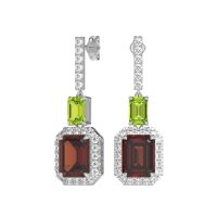 These 14k White Gold Garnet earrings feature fine quality with Garnet, Peridot and Lab Diamond gemstones. These Sophisticated Dangling Earrings Showcase A Captivating Linear Design, Starting With A Brilliant Bar Of Gemstones At The Top. This Connects Gracefully To A Striking Emerald-cut Stone, Which In Turn Leads To A Larger, Radiant Emerald-cut Stone Beautifully Encircled By A Sparkling Halo At The Bottom. The Tiered Arrangement And Precise Facets Of The Emerald Cuts Ensure Breathtaking Movement And Unparalleled Sparkle, Making A Truly Elegant Statement. Free shipping, returns, and a lifetime warranty make luxury worry-free.