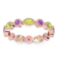 This Peridot wedding ring is casted in 14K Rose Gold and set with fine quality Peridot and Amethyst. All of the gemstones we use are of the top 10% available, those found in fine quality boutiques across the world. This Peridot wedding band can also be added to your collection of minimalist Peridot rings. This Band Features Small Round Brilliants Gems Set in A Vintage Eternity Ring with Milgrain Accents Around The Entire Shank. Customize And Build Your Own Birthstone Ring By Selecting The Gems And Metals Of Your Choice. Free shipping, returns, resizing, and a lifetime warranty ensure you love your purchase.