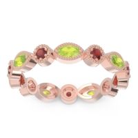 This Peridot wedding ring is casted in 18K Rose Gold and set with fine quality Peridot and Garnet. All of the gemstones we use are of the top 10% available, those found in fine quality boutiques across the world. This Peridot wedding band can also be added to your collection of minimalist Peridot rings. This Band Features Small Round Brilliants Gems Set in A Vintage Eternity Ring with Milgrain Accents Around The Entire Shank. Customize And Build Your Own Birthstone Ring By Selecting The Gems And Metals Of Your Choice. Free shipping, returns, resizing, and a lifetime warranty ensure you love your purchase.
