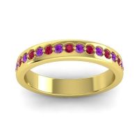 This Ruby wedding ring is casted in 18k Yellow Gold and set with fine quality Ruby and Amethyst. All of the gemstones we use are of the top 10% available, those found in fine quality boutiques across the world. This Ruby wedding band can also be added to your collection of minimalist Ruby rings. This Design Is A Modern interpretation On The Eternity Band. Your Round Colored Stones Are Set in A 2 Prong Shared Setting in Wells That Take The Shape Of The Gems. The Flat Band Adds A Pleasant Contrast To The Brilliance Of Your Gems. Free shipping, returns, resizing, and a lifetime warranty ensure you love your purchase.