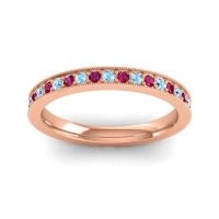 This Aquamarine wedding ring is casted in 14K Rose Gold and set with fine quality Aquamarine and Ruby. All of the gemstones we use are of the top 10% available, those found in fine quality boutiques across the world. This Aquamarine wedding band can also be added to your collection of minimalist Aquamarine rings. This Classic Band Is An Essential For Any Collection with All The Elements That Make A Timeless Piece Of Jewelry. Your Round Colored Stones Are Channel Set Around An Eternity Band with A Row Of Milgrain Accents. Free shipping, returns, resizing, and a lifetime warranty ensure you love your purchase.