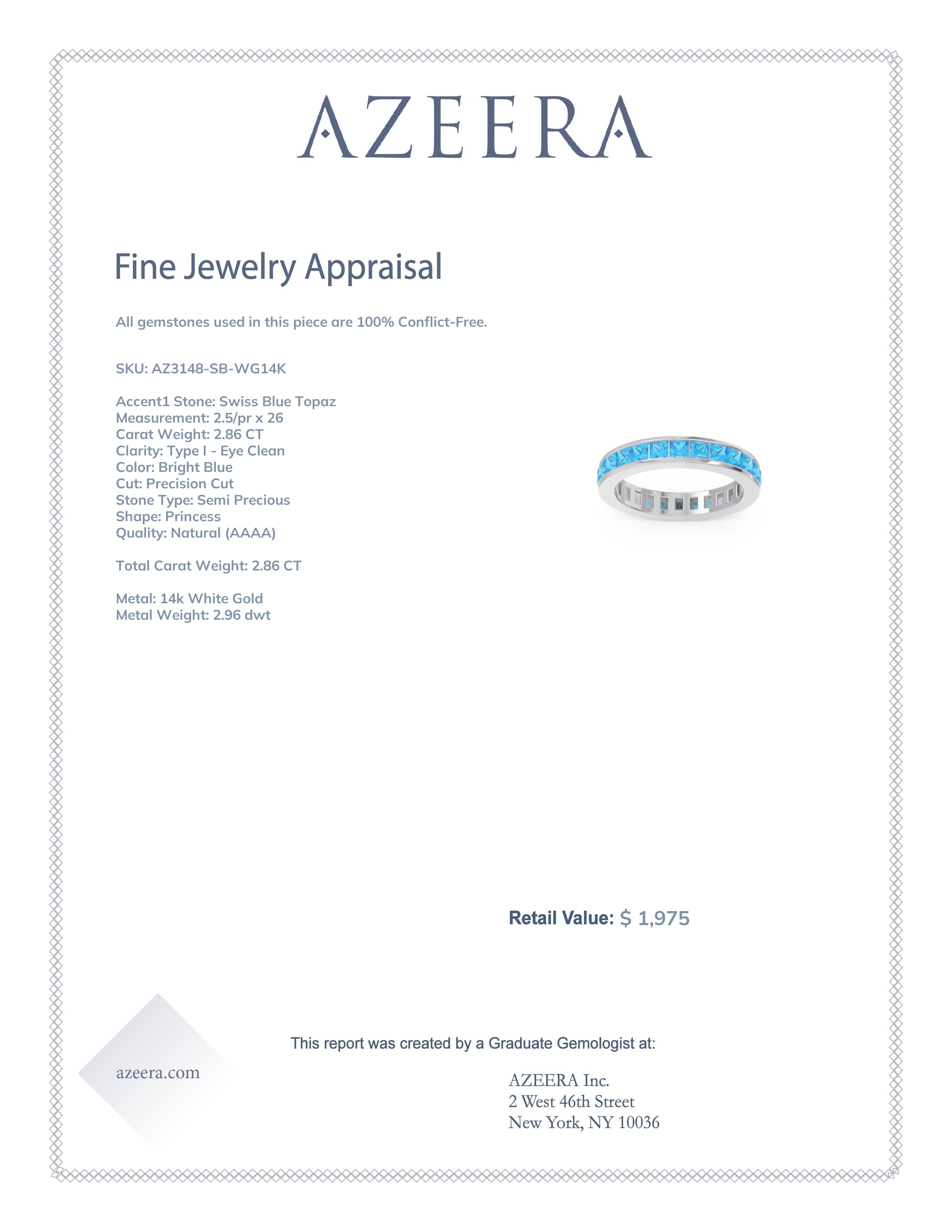 This Swiss Blue Topaz wedding ring is set with AAAA Swiss Blue Topaz, amongst the top 10% of material available. This ring can be casted in your choice of 9 metals. Swiss Blue Topaz rings can be worn as gemstone wedding rings, or can even be stacked with your other gemstone rings. This Band Features Small Princess Cut Gems in A Channel Setting All The Way Around The Shank in An Eternity Setting. Choose from a variety of gems and metals to make truly unique custom rings! Free shipping, returns, resizing, and a lifetime warranty make choosing this product easy.