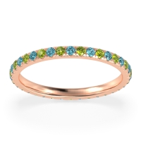 This Swiss Blue Topaz wedding ring is casted in 18K Rose Gold and set with fine quality Swiss Blue Topaz and Peridot. All of the gemstones we use are of the top 10% available, those found in fine quality boutiques across the world. This Swiss Blue Topaz wedding band can also be added to your collection of minimalist Swiss Blue Topaz rings. This Classic Eternity Band Effortlessly Elevates Any Finger, Whether Worn Alone Or with Other Rings. Free shipping, returns, resizing, and a lifetime warranty ensure you love your purchase.