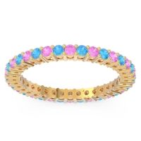 This Pink Tourmaline wedding ring is casted in 14k Yellow Gold and set with fine quality Pink Tourmaline and Swiss Blue Topaz. All of the gemstones we use are of the top 10% available, those found in fine quality boutiques across the world. This Pink Tourmaline wedding band can also be added to your collection of minimalist Pink Tourmaline rings. This Band Features Small Round Brilliant Gems Set in An Eternity Ring Around The Entire Shank. Free shipping, returns, resizing, and a lifetime warranty ensure you love your purchase.