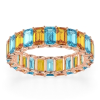 This Swiss Blue Topaz wedding ring is casted in 18K Rose Gold and set with fine quality Swiss Blue Topaz and Citrine. All of the gemstones we use are of the top 10% available, those found in fine quality boutiques across the world. This Swiss Blue Topaz wedding band can also be added to your collection of minimalist Swiss Blue Topaz rings. This Classic Eternity Ring Features An Endless Circle Of Emerald-cut Stones, Given A Modern Edge with Contemporary U-prong Settings. Free shipping, returns, resizing, and a lifetime warranty ensure you love your purchase.