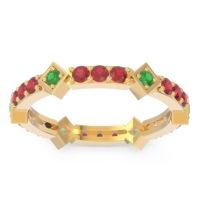 This Ruby wedding ring is casted in 14k Yellow Gold and set with fine quality Ruby and Emerald. All of the gemstones we use are of the top 10% available, those found in fine quality boutiques across the world. This Ruby wedding band can also be added to your collection of minimalist Ruby rings. This Band Features Small Round Brilliants Gems Set in An Eternity Ring Accented with Geometric Patterns Around The Shank. Free shipping, returns, resizing, and a lifetime warranty ensure you love your purchase.