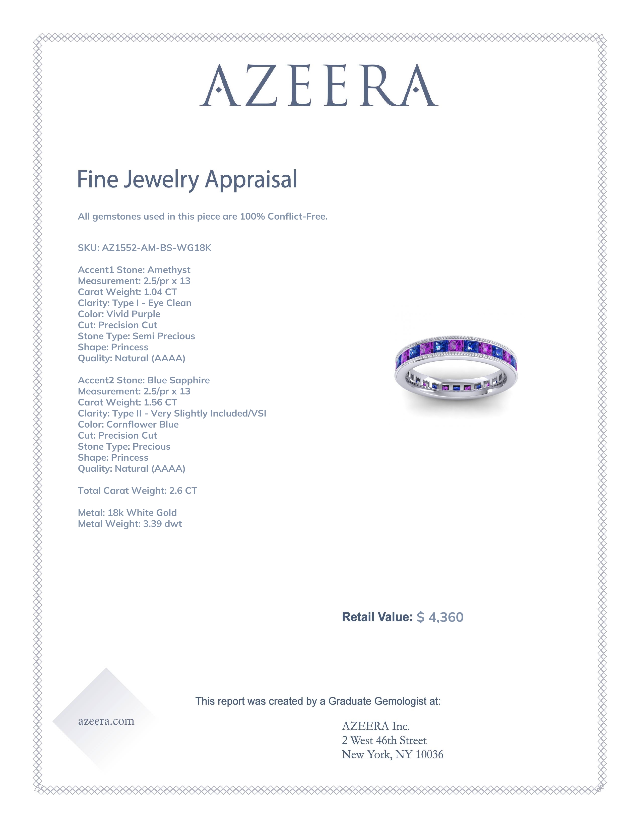 This Amethyst wedding ring is casted in 18k White Gold and set with fine quality Amethyst and Blue Sapphire. All of the gemstones we use are of the top 10% available, those found in fine quality boutiques across the world. This Amethyst wedding band can also be added to your collection of minimalist Amethyst rings. This Charming Band Is An Essential For Any Collection And Holds All The Elements That Make A Timeless Piece Of Jewelry. Your Square Princess Cut Stones Are Channel Set Around An Eternity Band with Milgrain Accents. Free shipping, returns, resizing, and a lifetime warranty ensure you love your purchase.
