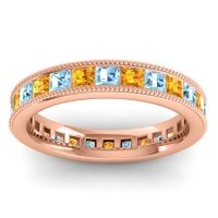 This Aquamarine wedding ring is casted in 18K Rose Gold and set with fine quality Aquamarine and Citrine. All of the gemstones we use are of the top 10% available, those found in fine quality boutiques across the world. This Aquamarine wedding band can also be added to your collection of minimalist Aquamarine rings. This Charming Band Is An Essential For Any Collection And Holds All The Elements That Make A Timeless Piece Of Jewelry. Your Square Princess Cut Stones Are Channel Set Around An Eternity Band with Milgrain Accents. Free shipping, returns, resizing, and a lifetime warranty ensure you love your purchase.