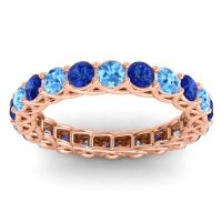 This Swiss Blue Topaz wedding ring is casted in 14K Rose Gold and set with fine quality Swiss Blue Topaz and Blue Sapphire. All of the gemstones we use are of the top 10% available, those found in fine quality boutiques across the world. This Swiss Blue Topaz wedding band can also be added to your collection of minimalist Swiss Blue Topaz rings. This Stylish Ring Uses The Trellis Pattern To Create An Elegant Floral Motif. Your Round Colored Stones Sit in A 4 Prong Shared Setting And Appear As Flowers Strung Together in Garland Around Your Finger. Free shipping, returns, resizing, and a lifetime warranty ensure you love your purchase.