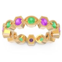 This Emerald wedding ring is casted in 18k Yellow Gold and set with fine quality Emerald and Amethyst. All of the gemstones we use are of the top 10% available, those found in fine quality boutiques across the world. This Emerald wedding band can also be added to your collection of minimalist Emerald rings. This Art Deco inspired Ring Features Round Brilliant Gems in Sunken Shared Prong Setting with Alternating Baskets Of Marquise And Hexagon Shapes And Milgrain Detail All The Way Around The Shank in An Eternity Setting. Free shipping, returns, resizing, and a lifetime warranty ensure you love your purchase.