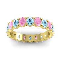 This Aquamarine wedding ring is casted in 18k Yellow Gold and set with fine quality Aquamarine and Pink Tourmaline. All of the gemstones we use are of the top 10% available, those found in fine quality boutiques across the world. This Aquamarine wedding band can also be added to your collection of minimalist Aquamarine rings. This Creative Design Utilizes The Prongs As A Design Element And Creates Columnar Forms Around The Profile. Your Oval Shaped Colored Sit in A 4 Prong Setting Width Wise Around The Band Creating A Bolder Look. Free shipping, returns, resizing, and a lifetime warranty ensure you love your purchase.