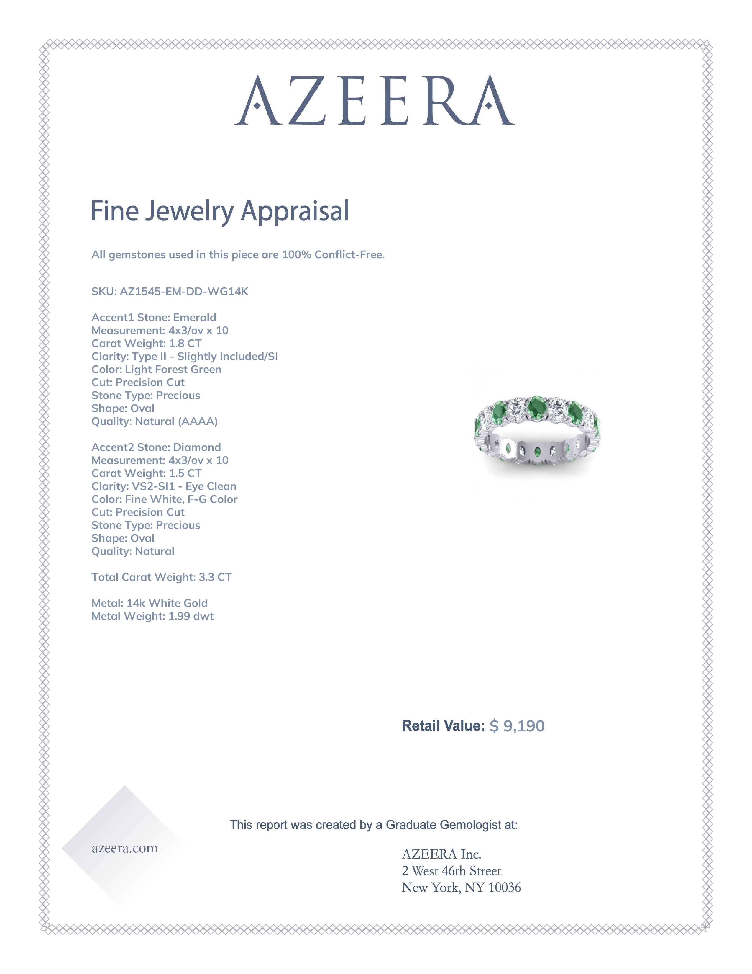 This Emerald wedding ring is casted in 14k White Gold and set with fine quality Emerald and Diamond. All of the gemstones we use are of the top 10% available, those found in fine quality boutiques across the world. This Emerald wedding band can also be added to your collection of minimalist Emerald rings. This Creative Design Utilizes The Prongs As A Design Element And Creates Columnar Forms Around The Profile. Your Oval Shaped Colored Sit in A 4 Prong Setting Width Wise Around The Band Creating A Bolder Look. Free shipping, returns, resizing, and a lifetime warranty ensure you love your purchase.
