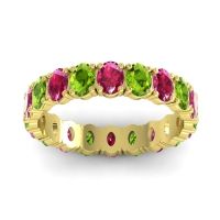 This Ruby wedding ring is casted in 18k Yellow Gold and set with fine quality Ruby and Peridot. All of the gemstones we use are of the top 10% available, those found in fine quality boutiques across the world. This Ruby wedding band can also be added to your collection of minimalist Ruby rings. This Creative Design Utilizes The Prongs As A Design Element And Creates Columnar Forms Around The Profile. Your Oval Shaped Colored Sit in A 4 Prong Setting Width Wise Around The Band Creating A Bolder Look. Free shipping, returns, resizing, and a lifetime warranty ensure you love your purchase.