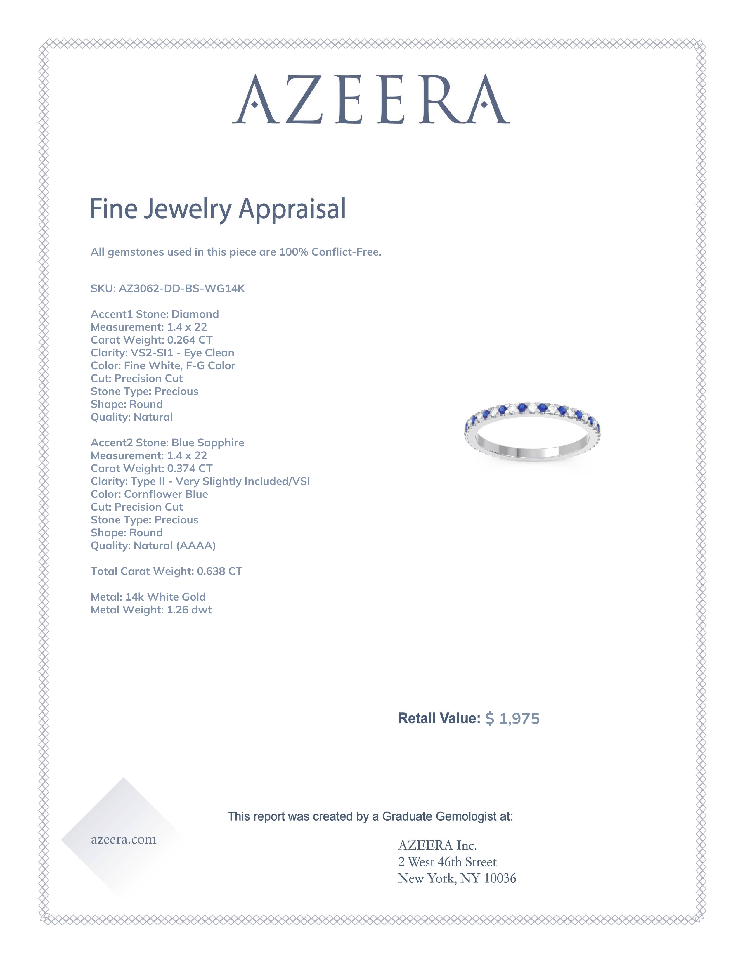This Diamond wedding ring is casted in 14k White Gold and set with fine quality Diamond and Blue Sapphire. All of the gemstones we use are of the top 10% available, those found in fine quality boutiques across the world. This Diamond wedding band can also be added to your collection of minimalist Diamond rings. This Ring Features Round Brilliant Gems in A Slender Shared Scalloped Prong Eternity Setting. Free shipping, returns, resizing, and a lifetime warranty ensure you love your purchase.