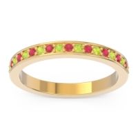 This Ruby wedding ring is casted in 14k Yellow Gold and set with fine quality Ruby and Peridot. All of the gemstones we use are of the top 10% available, those found in fine quality boutiques across the world. This Ruby wedding band can also be added to your collection of minimalist Ruby rings. This Ring Features Round Brilliant Gems Prong Set Between Two Secure Walls All The Way Around The Shank in An Eternity Setting. Free shipping, returns, resizing, and a lifetime warranty ensure you love your purchase.