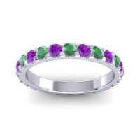 This Emerald wedding ring is casted in Palladium and set with fine quality Emerald and Amethyst. All of the gemstones we use are of the top 10% available, those found in fine quality boutiques across the world. This Emerald wedding band can also be added to your collection of minimalist Emerald rings. This Band Radiates Sophistication While Also Making A Statement. Your Round Color Stones Sit in A 4 Prong Scalloped Pave Setting. The Texture Of The Wells Adds A Pleasant And Subtle Contrast To The Brilliance Of The Gems. Free shipping, returns, resizing, and a lifetime warranty ensure you love your purchase.