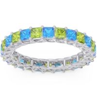 This Peridot wedding ring is casted in 14k White Gold and set with fine quality Peridot and Swiss Blue Topaz. All of the gemstones we use are of the top 10% available, those found in fine quality boutiques across the world. This Peridot wedding band can also be added to your collection of minimalist Peridot rings. This Band Features Gems in A Shared Trellis Setting in An Eternity Ring Around The Entire Shank. Free shipping, returns, resizing, and a lifetime warranty ensure you love your purchase.