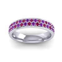 This Ruby wedding ring is casted in 14k White Gold and set with fine quality Ruby and Amethyst. All of the gemstones we use are of the top 10% available, those found in fine quality boutiques across the world. This Ruby wedding band can also be added to your collection of minimalist Ruby rings. This Opulent Design Is Perfect For Making A Statement. Your Round Colored Stones Sit in individual 4 Prong Settings in Two Rows Across The Band To Ensure That The Brilliance On Your Finger Is Seen. Free shipping, returns, resizing, and a lifetime warranty ensure you love your purchase.