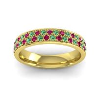 This Ruby wedding ring is casted in 14k Yellow Gold and set with fine quality Ruby and Emerald. All of the gemstones we use are of the top 10% available, those found in fine quality boutiques across the world. This Ruby wedding band can also be added to your collection of minimalist Ruby rings. This Opulent Design Is Perfect For Making A Statement. Your Round Colored Stones Sit in individual 4 Prong Settings in Two Rows Across The Band To Ensure That The Brilliance On Your Finger Is Seen. Free shipping, returns, resizing, and a lifetime warranty ensure you love your purchase.
