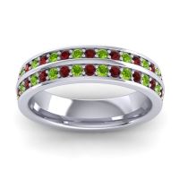 This Peridot wedding ring is casted in 14k White Gold and set with fine quality Peridot and Garnet. All of the gemstones we use are of the top 10% available, those found in fine quality boutiques across the world. This Peridot wedding band can also be added to your collection of minimalist Peridot rings. This Stunning Band Is Both Functional And Stylish. Your Round Colored Stones Sit in A 4 Prong Shared Setting in Rows Between Bars Of Precious Metal Appearing As Two Bands Stacked Together. Free shipping, returns, resizing, and a lifetime warranty ensure you love your purchase.