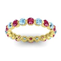 This Ruby wedding ring is casted in 14k Yellow Gold and set with fine quality Ruby and Aquamarine. All of the gemstones we use are of the top 10% available, those found in fine quality boutiques across the world. This Ruby wedding band can also be added to your collection of minimalist Ruby rings. This Exciting Design Utilizes An Uncommon Setting Technique To Make A Statement. Your Round Colored Stones Are Bar Set Around The Eternity Band Creating A Stunning Alternative Look. Free shipping, returns, resizing, and a lifetime warranty ensure you love your purchase.