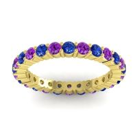 This Blue Sapphire wedding ring is casted in 18k Yellow Gold and set with fine quality Blue Sapphire and Amethyst. All of the gemstones we use are of the top 10% available, those found in fine quality boutiques across the world. This Blue Sapphire wedding band can also be added to your collection of minimalist Blue Sapphire rings. This Creative Design Utilizes The Prongs As A Design Element And Creates Columnar Forms Around The Profile. Your Round Colored Sit in A 4 Prong Setting Around The Band with The Undulating Profile Providing A Pleasant Contrast. Free shipping, returns, resizing, and a lifetime warranty ensure you love your purchase.