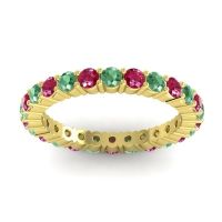 This Emerald wedding ring is casted in 14k Yellow Gold and set with fine quality Emerald and Ruby. All of the gemstones we use are of the top 10% available, those found in fine quality boutiques across the world. This Emerald wedding band can also be added to your collection of minimalist Emerald rings. This Creative Design Utilizes The Prongs As A Design Element And Creates Columnar Forms Around The Profile. Your Round Colored Sit in A 4 Prong Setting Around The Band with The Undulating Profile Providing A Pleasant Contrast. Free shipping, returns, resizing, and a lifetime warranty ensure you love your purchase.