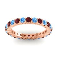 This Garnet wedding ring is casted in 18K Rose Gold and set with fine quality Garnet and Swiss Blue Topaz. All of the gemstones we use are of the top 10% available, those found in fine quality boutiques across the world. This Garnet wedding band can also be added to your collection of minimalist Garnet rings. This Creative Design Utilizes The Prongs As A Design Element And Creates Columnar Forms Around The Profile. Your Round Colored Sit in A 4 Prong Setting Around The Band with The Undulating Profile Providing A Pleasant Contrast. Free shipping, returns, resizing, and a lifetime warranty ensure you love your purchase.