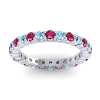 This Ruby wedding ring is casted in Platinum and set with fine quality Ruby and Aquamarine. All of the gemstones we use are of the top 10% available, those found in fine quality boutiques across the world. This Ruby wedding band can also be added to your collection of minimalist Ruby rings. This Creative Design Utilizes The Prongs As A Design Element And Creates Columnar Forms Around The Profile. Your Round Colored Sit in A 4 Prong Setting Around The Band with The Undulating Profile Providing A Pleasant Contrast. Free shipping, returns, resizing, and a lifetime warranty ensure you love your purchase.