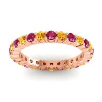 This Ruby wedding ring is casted in 18K Rose Gold and set with fine quality Ruby and Citrine. All of the gemstones we use are of the top 10% available, those found in fine quality boutiques across the world. This Ruby wedding band can also be added to your collection of minimalist Ruby rings. This Creative Design Utilizes The Prongs As A Design Element And Creates Columnar Forms Around The Profile. Your Round Colored Sit in A 4 Prong Setting Around The Band with The Undulating Profile Providing A Pleasant Contrast. Free shipping, returns, resizing, and a lifetime warranty ensure you love your purchase.