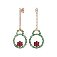 These 18K Rose Gold Ruby earrings feature fine quality with Ruby, Emerald and Lab Diamond gemstones. Make A Sophisticated Statement With These Striking Fashion Earrings. They Feature A Long, Dazzling Row Of Gemstones, Culminating In An Elegant Dangling Circle-within-circle Design For A Modern And Captivating Look. Free shipping, returns, and a lifetime warranty make luxury worry-free.