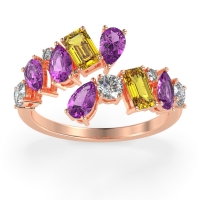 This 14K Rose Gold Amethyst wedding ring features gemstones, along with fine quality Citrine and Diamond. We only use the top 10% of gemstones available. This women's ring can be worn as a Amethyst wedding band, or even as an addition to your Amethyst rings collection. This Trendy Band Showcases A Playful Mix Of Pear, Round, And Emerald-cut Stones Set in A Split Shank Design. This product comes with Free Shipping, Free Returns, Free Resize and a lifetime warranty. Choose from a variety of gems and metals to make a truly unique custom band!.