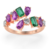 This 14K Rose Gold Amethyst wedding ring features gemstones, along with fine quality Emerald and Diamond. We only use the top 10% of gemstones available. This women's ring can be worn as a Amethyst wedding band, or even as an addition to your Amethyst rings collection. This Trendy Band Showcases A Playful Mix Of Pear, Round, And Emerald-cut Stones Set in A Split Shank Design. This product comes with Free Shipping, Free Returns, Free Resize and a lifetime warranty. Choose from a variety of gems and metals to make a truly unique custom band!.