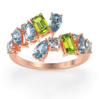 This 18K Rose Gold Aquamarine wedding ring features gemstones, along with fine quality Peridot and Diamond. We only use the top 10% of gemstones available. This women's ring can be worn as a Aquamarine wedding band, or even as an addition to your Aquamarine rings collection. This Trendy Band Showcases A Playful Mix Of Pear, Round, And Emerald-cut Stones Set in A Split Shank Design. This product comes with Free Shipping, Free Returns, Free Resize and a lifetime warranty. Choose from a variety of gems and metals to make a truly unique custom band!.