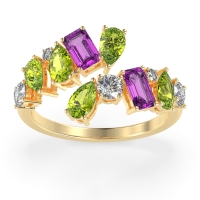 This 18k Yellow Gold Peridot wedding ring features gemstones, along with fine quality Amethyst and Diamond. We only use the top 10% of gemstones available. This women's ring can be worn as a Peridot wedding band, or even as an addition to your Peridot rings collection. This Trendy Band Showcases A Playful Mix Of Pear, Round, And Emerald-cut Stones Set in A Split Shank Design. This product comes with Free Shipping, Free Returns, Free Resize and a lifetime warranty. Choose from a variety of gems and metals to make a truly unique custom band!.