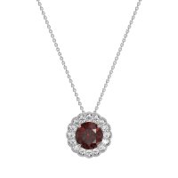 This Garnet and Lab Diamond Necklace is casted in Palladium. This Women’s Halo necklace features exceptionally fine gemstones, on par with those found in the world's most exclusive boutiques and among the top 10% available globally. This Floral-inspired Halo Pendant Features A Prominent Round Center Stone Encircled By A Vintage-style Milgrain Halo, Creating A Charming, Antique Aesthetic. This necklace comes with a complimentary 18-inch chain. Enjoy the confidence of our 30-day, stress-free return policy—with return shipping fully covered. Each piece is also accompanied by a Lifetime Warranty, ensuring lasting beauty and peace of mind.