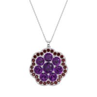 This Amethyst and Ruby Necklace is casted in 14k White Gold. This Women’s Fashion necklace features exceptionally fine gemstones, on par with those found in the world's most exclusive boutiques and among the top 10% available globally. This Flower Pendant Showcases A Cluster Of Stones Meticulously Arranged To Form A Delicate Flower At Its Center. This Floral Core Is Then Embraced By An Outer Halo Also Crafted in A Graceful Flower Shape. This necklace comes with a complimentary 18-inch chain. Enjoy the confidence of our 30-day, stress-free return policy—with return shipping fully covered. Each piece is also accompanied by a Lifetime Warranty, ensuring lasting beauty and peace of mind.