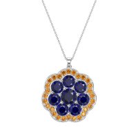 This Blue Sapphire and Citrine Necklace is casted in 14k White Gold. This Women’s Fashion necklace features exceptionally fine gemstones, on par with those found in the world's most exclusive boutiques and among the top 10% available globally. This Flower Pendant Showcases A Cluster Of Stones Meticulously Arranged To Form A Delicate Flower At Its Center. This Floral Core Is Then Embraced By An Outer Halo Also Crafted in A Graceful Flower Shape. This necklace comes with a complimentary 18-inch chain. Enjoy the confidence of our 30-day, stress-free return policy—with return shipping fully covered. Each piece is also accompanied by a Lifetime Warranty, ensuring lasting beauty and peace of mind.