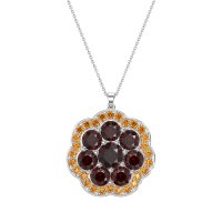 This Garnet and Citrine Necklace is casted in 14k White Gold. This Women’s Fashion necklace features exceptionally fine gemstones, on par with those found in the world's most exclusive boutiques and among the top 10% available globally. This Flower Pendant Showcases A Cluster Of Stones Meticulously Arranged To Form A Delicate Flower At Its Center. This Floral Core Is Then Embraced By An Outer Halo Also Crafted in A Graceful Flower Shape. This necklace comes with a complimentary 18-inch chain. Enjoy the confidence of our 30-day, stress-free return policy—with return shipping fully covered. Each piece is also accompanied by a Lifetime Warranty, ensuring lasting beauty and peace of mind.