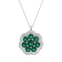 This Lab Emerald and Lab Diamond Necklace is casted in Palladium. This Women’s Fashion necklace features exceptionally fine gemstones, on par with those found in the world's most exclusive boutiques and among the top 10% available globally. This Flower Pendant Showcases A Cluster Of Stones Meticulously Arranged To Form A Delicate Flower At Its Center. This Floral Core Is Then Embraced By An Outer Halo Also Crafted in A Graceful Flower Shape. This necklace comes with a complimentary 18-inch chain. Enjoy the confidence of our 30-day, stress-free return policy—with return shipping fully covered. Each piece is also accompanied by a Lifetime Warranty, ensuring lasting beauty and peace of mind.