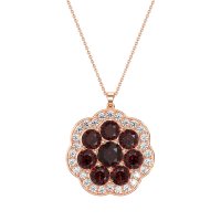 This Lab Ruby and Lab Diamond Necklace is casted in 18K Rose Gold. This Women’s Fashion necklace features exceptionally fine gemstones, on par with those found in the world's most exclusive boutiques and among the top 10% available globally. This Flower Pendant Showcases A Cluster Of Stones Meticulously Arranged To Form A Delicate Flower At Its Center. This Floral Core Is Then Embraced By An Outer Halo Also Crafted in A Graceful Flower Shape. This necklace comes with a complimentary 18-inch chain. Enjoy the confidence of our 30-day, stress-free return policy—with return shipping fully covered. Each piece is also accompanied by a Lifetime Warranty, ensuring lasting beauty and peace of mind.