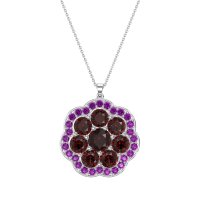 This Ruby and Amethyst Necklace is casted in 14k White Gold. This Women’s Fashion necklace features exceptionally fine gemstones, on par with those found in the world's most exclusive boutiques and among the top 10% available globally. This Flower Pendant Showcases A Cluster Of Stones Meticulously Arranged To Form A Delicate Flower At Its Center. This Floral Core Is Then Embraced By An Outer Halo Also Crafted in A Graceful Flower Shape. This necklace comes with a complimentary 18-inch chain. Enjoy the confidence of our 30-day, stress-free return policy—with return shipping fully covered. Each piece is also accompanied by a Lifetime Warranty, ensuring lasting beauty and peace of mind.